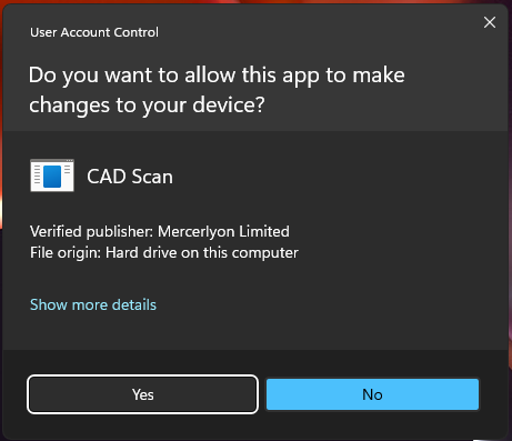 CAD Scan requires elevated privileges as it adds a small config file to MicroStation, please run the setup program as the user who wants use CAD Scan and if the user doesn't have admin privileges ask an administrator to type their username and password at the User Account Control step below.