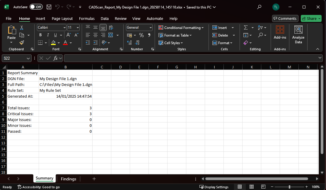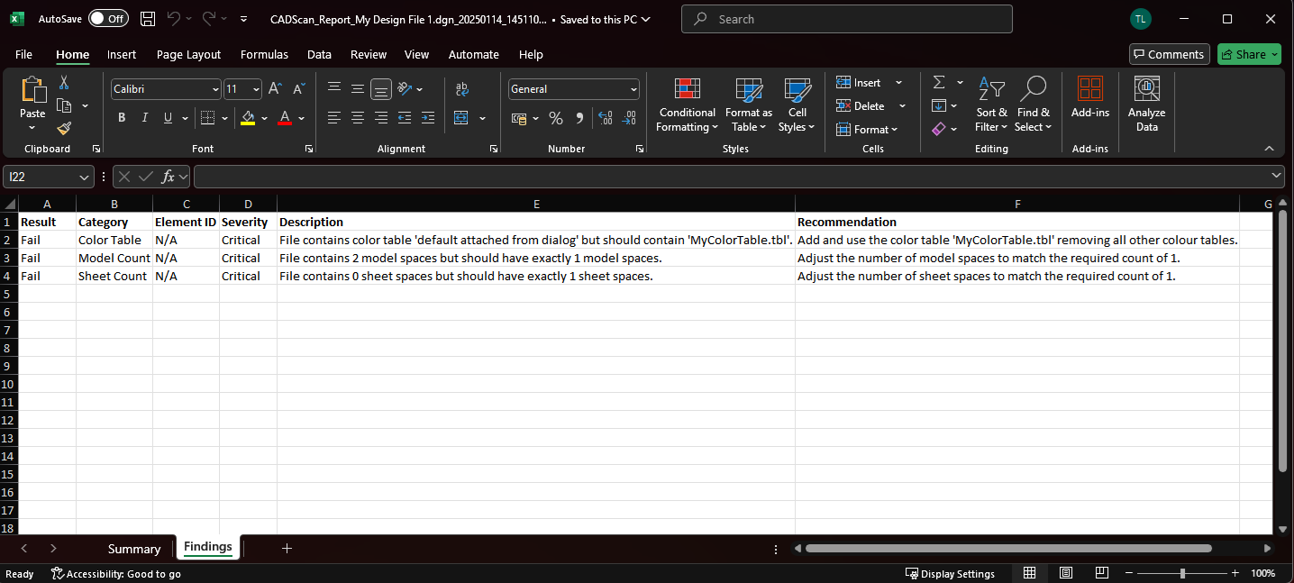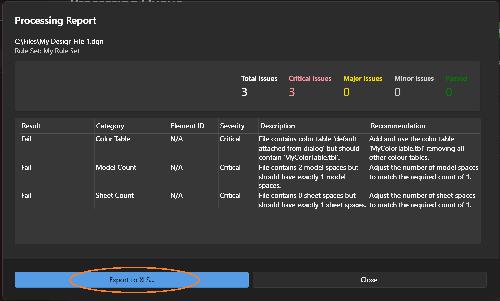 The single file processing report will be displayed showing all failures and passes, giving explanations and recommendations. Reports can be exported to Microsoft Excel format buy clicking on the 'Export to XLS...' button. This will open a save file dialog where you can save your exported XLS file.