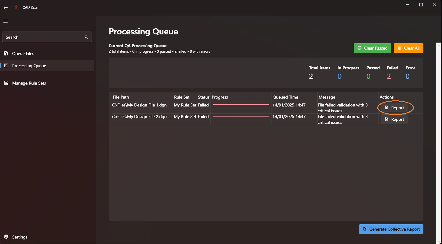Click the 'Report' button to the right of an individual checked file. If a file has not finished processing the button will be disabled.