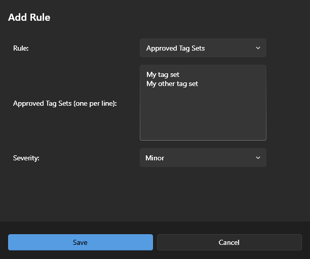 - If you want to check that the models in a DGN file ONLY contain two tag sets, 'My tag set' and 'My other tag set', then add this Rule to your Rule Set with the two tag set names, one per line as in the below screen shot: