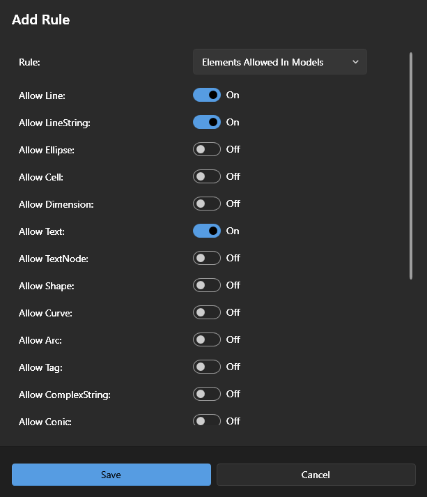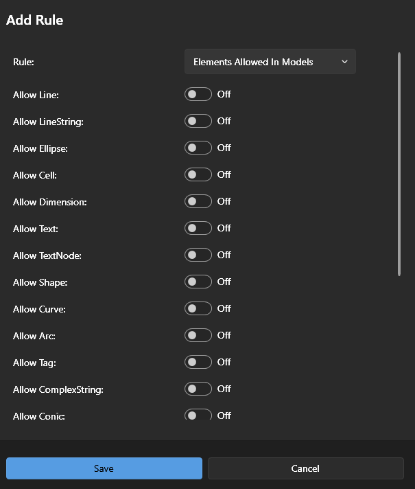 This Rule checks all the graphical elements in all model spaces in a DGN file against those element types explicitly set as 'allowed'.