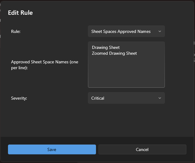 If you want to check that for 2 approved sheet space names in a DGN file then add this Rule to your Rule Set with 2 sheet space names specified as per the below screen shot. Each name should be on a separate line.